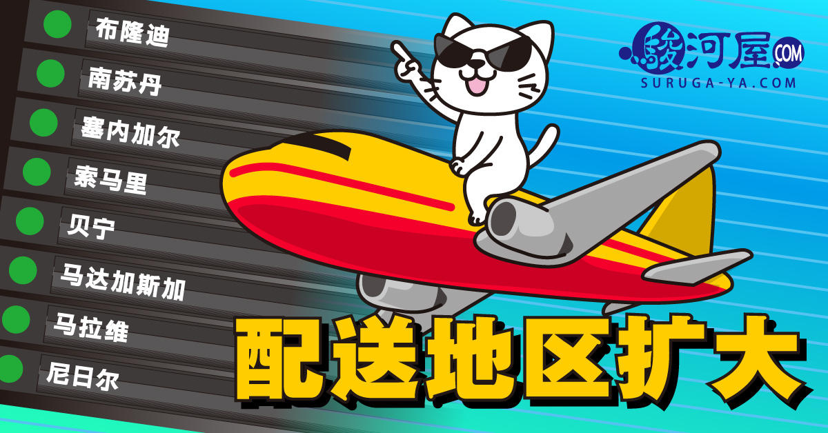 骏河屋发布了8个可配送商品的地区! 还有正在进行的「包邮活动」! 新增配送地区:布隆迪共和国、南苏丹共和国、塞内加尔、索马里、贝宁、马达加斯加、马拉维、尼日尔 布隆迪共和国、南苏丹共和国、塞内加尔、索马里、贝宁、马达加斯加、马拉维、尼日尔的各位、让您久等了! 您在SURUGA-YA.COM购买的商品、可以配送了! 请马上到SURUGA-YA.COM享受购物的乐趣♪ 期待您的订购...