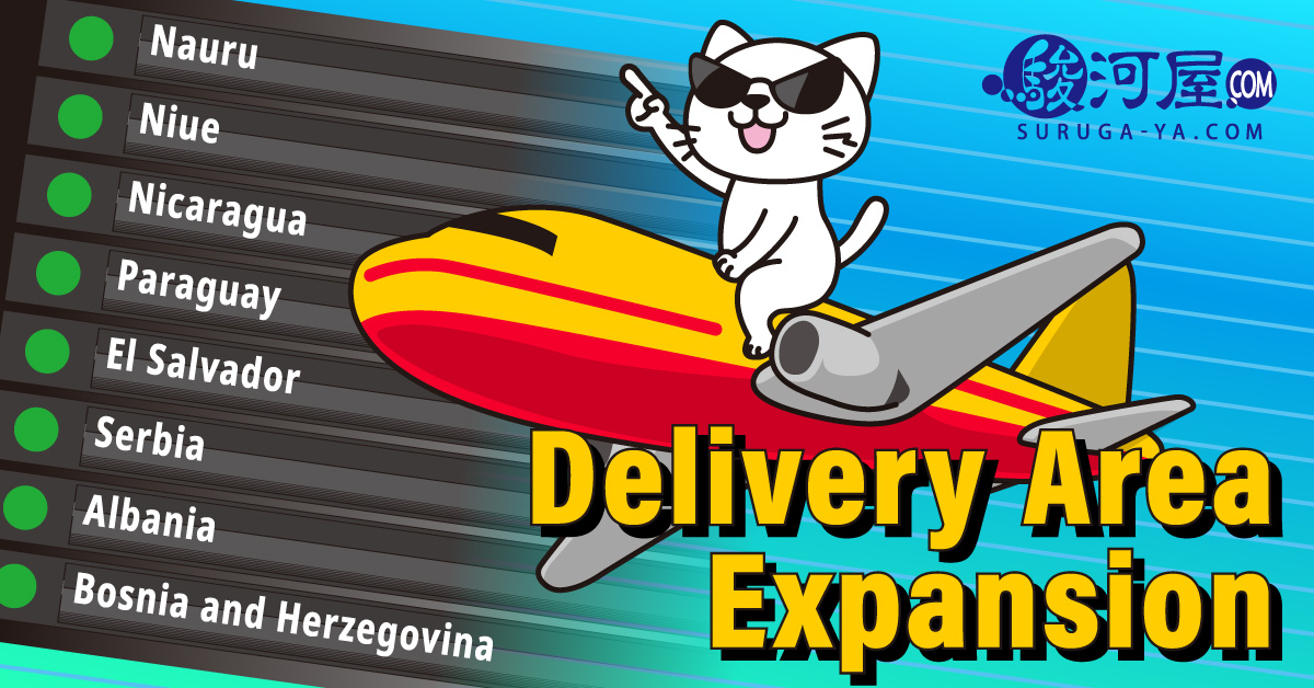 駿河屋から商品が配送できるようになった8エリアを発表! そして実施中の「送料無料キャンペーン」についてもご案内します! 新たに配送可能になったのは、ナウル、ニウエ、ニカラグア、パラグアイ、エルサルバドル、セルビア、アルバニア、ボスニア・ヘルツェゴビナ ナウル、ニウエ、ニカラグア、パラグアイ、エルサルバドル、セルビア、アルバニア、ボスニア・ヘルツェゴビナにお住まいのみなさま、お待たせし...