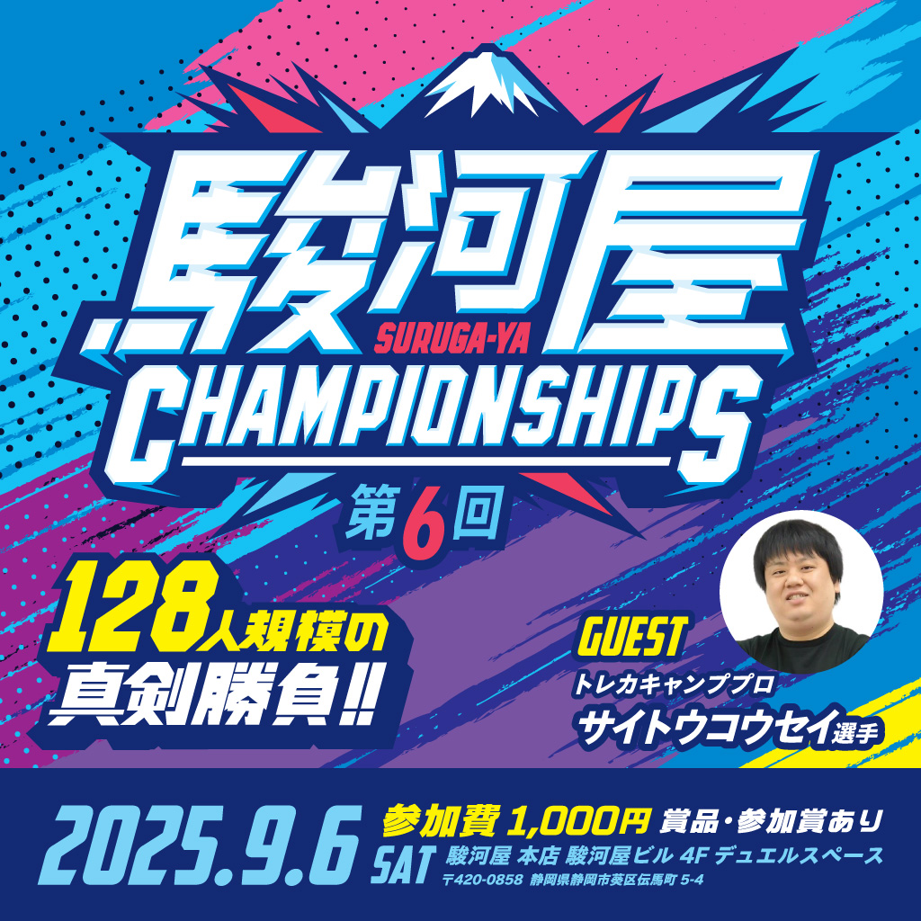 9/6(土)「駿河屋 本店 駿河屋ビル」にて「第6回 駿河屋 CHAMPIONSHIPS」を開催いたします! 豪華ゲストを招いての駿河屋主催ポケモンカード大会! 日本旅行の予定がある方は参戦・観覧してください! YouTubeでライブ配信も予定しているので、おうちで日本の戦いを見届けてください! 参加者募集中★駿河屋主催ポケモンカード大会開催 大好評いただいている「駿河屋 CHA...