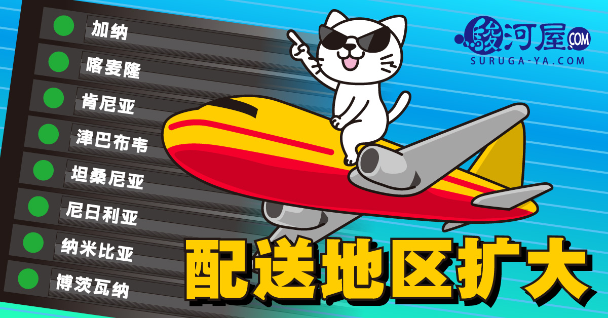 骏河屋发布了8个可配送商品的地区! 还有正在进行的「包邮活动」! 新增配送地区:加纳、喀麦隆、肯尼亚、津巴布韦、坦桑尼亚、尼日利亚、纳米比亚、博茨瓦纳 加纳、喀麦隆、肯尼亚、津巴布韦、坦桑尼亚、尼日利亚、纳米比亚、博茨瓦纳的各位、让您久等了! 您在SURUGA-YA.COM购买的商品、可以配送了! 请马上到SURUGA-YA.COM享受购物的乐趣♪ 期待您的订购! 国际邮...