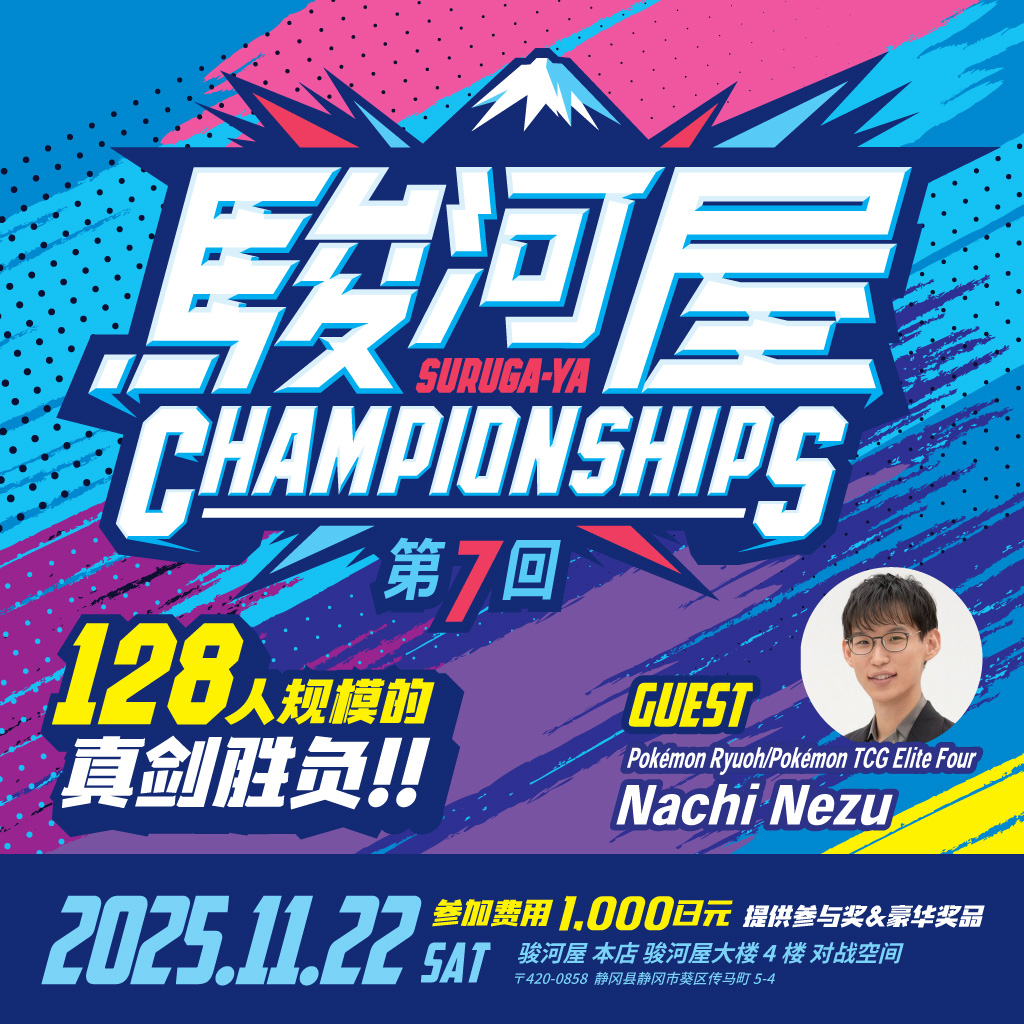 11/22(周六)将在「骏河屋 本店 骏河屋大楼」举办「第7届 骏河屋 CHAMPIONSHIPS」! 骏河屋主办、特邀豪华嘉宾的宝可梦卡牌锦标赛! 如果您有日本旅行的计划,请务必前来参赛或观战! 我们还计划在 YouTube 上进行直播,请在家中观看日本的精彩对决! 参赛者招募中★骏河屋主办的宝可梦卡牌锦标赛 「骏河屋 CHAMPIONSHIPS」向来深受好评。 11/22(...
