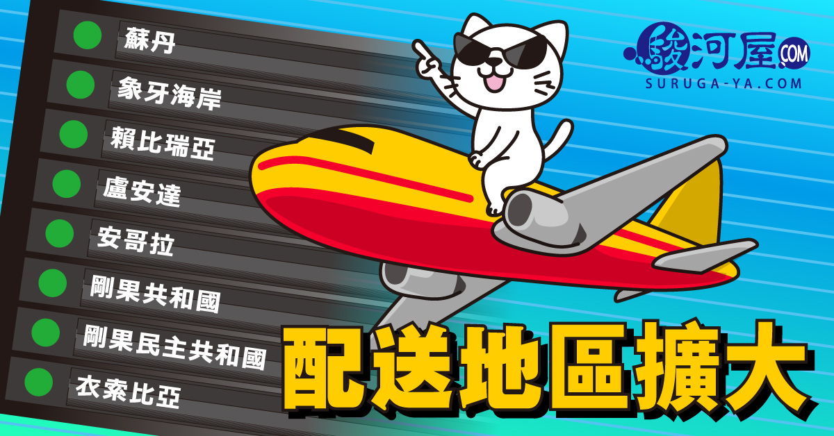 駿河屋發布了8個可以配送商品的地區! 以及實施中的「免運費活動」! 新增的配送地區:蘇丹、賴比瑞亞、盧安達、象牙海岸、剛果共和國、剛果民主共和國、安哥拉、衣索比亞 蘇丹、賴比瑞亞、盧安達、象牙海岸、剛果共和國、剛果民主共和國、安哥拉、衣索比亞的各位、讓您久等了! 在SURUGA-YA.COM購買的商品、可以配送了! 請馬上到SURUGA-YA.COM享受購物的樂趣♪ 期待您的訂...