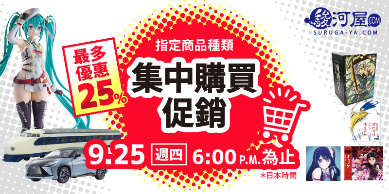 SURUGA-YA.COM從日本為您加油、願您的興趣生活更加精彩! 入手您最喜歡的日本的玩具・模型、音樂軟體、影片軟體、同人誌・同人商品的好機會! 不要錯過這個限時促銷! 玩具・模型、音樂軟體、影片軟體、同人誌・同人商品買越多越划算! 活動期間,集中購買指定商品即可享有最高25%OFF的驚人折扣! 立即查看詳情★ 活動期間 9/20(週六)10:00 A.M....