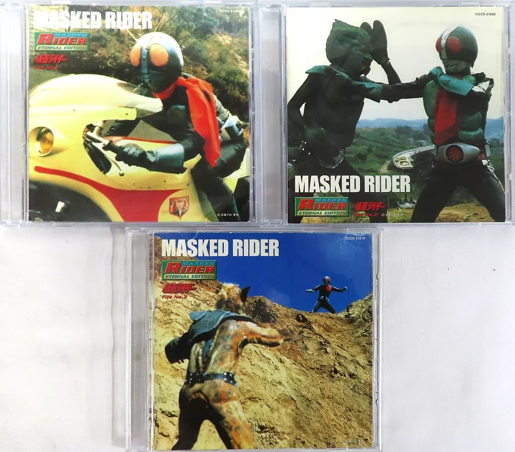 [1] (1) Let's go! Rider Kick (T.V. Size1 S. E. mix) (2) People in the dark (3) Secret Association Shocker (4) Pre-war (5) Song of Kamen Rider (T.V. Size Instrumental) (6) Vows of Warriors (7) Women attacked by Shocker (9) Song of Kamen Rider (Instrumental) (10) Let's go! Rider Kick (T.V. Size Instrumental) (11) Theme of Takeshi Hongo And (14) Let's go! Rider Kick (T.V. Size2 Chorus2) (15) Song of Kamen Rider (T.V. Size Chorus2) ("Kamen Rider! Hit Song Collection" "Side1" ") (16) Let's go! Rider Kick (17) Returning Rider (18) Lonely Kamen Rider (19) Devil Shocker (20) Rider Action (21) Rider's baby-sitter (Bonus Track) (22) prescoring Collection (23) TV Size Theme Song Variation : Let's go! Rider Kick (Size2 TypeB Chorus1)) - Let's go! Rider Kick (Born Size2 TypeB Chorus2) -" Side1 ") (3) Let's go! Rider Kick (Born Size2 TypeB Chorus2) -" The final edition! In addition to the theme songs of each rider, the first edition contains the broadcast sound effects and other materials in a no-cut recording. Although it is voluminous with 3 pieces set, you will not be able to listen to it because it reminds you of various scenes. It is satisfying even for fans and has a good remastering condition.