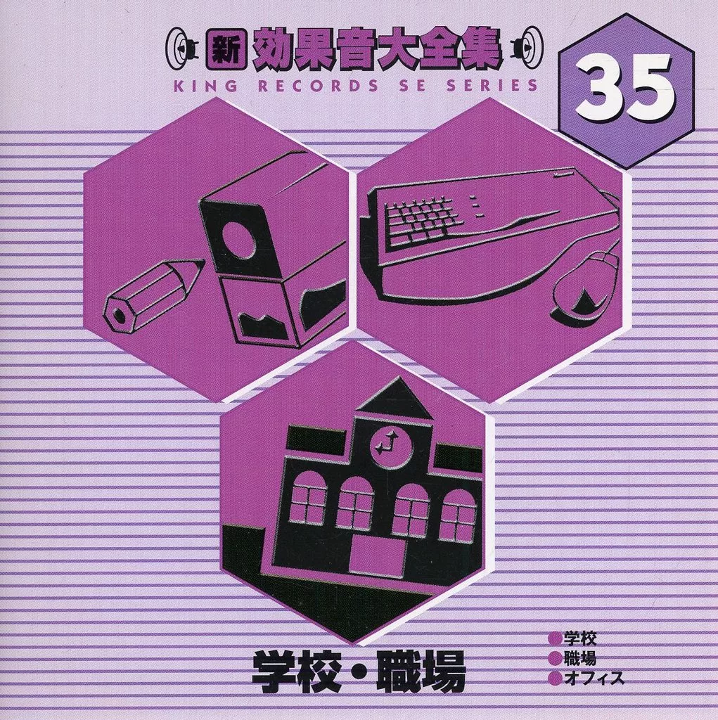 〈学校〉(1)学校のベル(2)下駄箱(3)階段(4)廊下(5)ドア開閉(6)号令(朝)(7)黒板に書く(8)黒板を叩く・消す(9)黒板消し機,パンパン(10)黒板を引っかく(11)号令(帰り)(12)掃除(13)幼稚園(校庭)風景(14)幼稚園(廊下)風景(15)小学校 授業風景(16)小学校 休み時間(17)中学校 休み時間(18)中学校 清掃時間風景(19)中学校 下校風景(20)中学校 合唱部〈職場〉(21)クリーニング屋(22)中華料理屋(23)蕎麦屋(24)畳屋 手作業(25)畳屋 機械(26)印刷所(27)美容院 カット(28)美容院 シャンプー(29)美容院 セット〈オフィス〉(30)コピー機(31)電話呼び出し音(32)ロッカー(33)ガラスロッカー(34)引き出し(35)パソコンのキーボード(36)電気スイッチ(37)ホワイトボード(38)鉛筆で書く(39)ボールペンで書く(40)自動鉛筆削り(41)手動鉛筆削り(42)消しゴム(43)セロファンテープ(44)ホッチキス(45)パンチング(46)プリンター