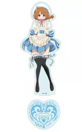 This is an acrylic stand with an illustration of giving a present in the costume of a cafe clerk.