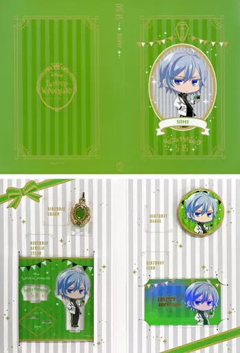 This is a set of birthday gift goods including metal badge, acrylic stand, charm and birthday card from "Disney Twisted Wonderland" which uses original design birthday art.