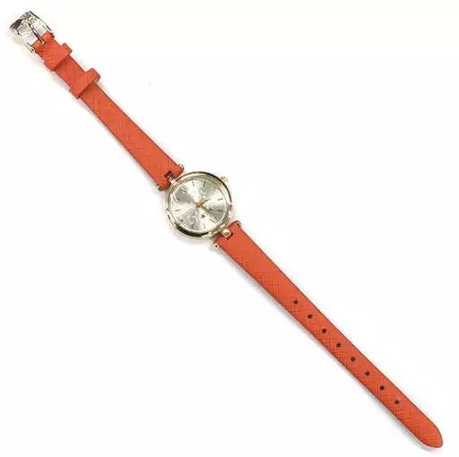 The watch by DRAMATIC STARS, which includes Teru Tento, Kaoru Sakuraba and Tsubaki Tsuba, has an orange belt and a gold case.