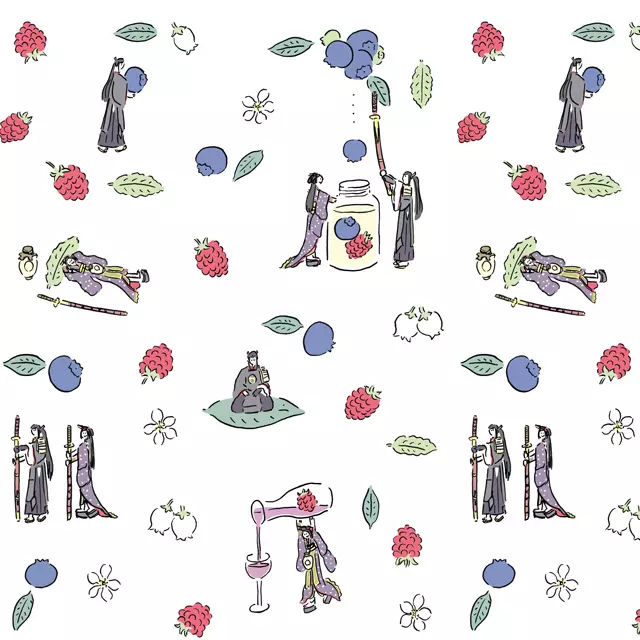 This textile is packed with the figure of the sword men who bend with fruits and the dwarfed sword men who play with fruits.