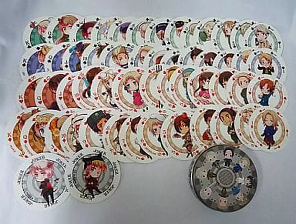 54 cards (each marks A to K and 2 Jokers)