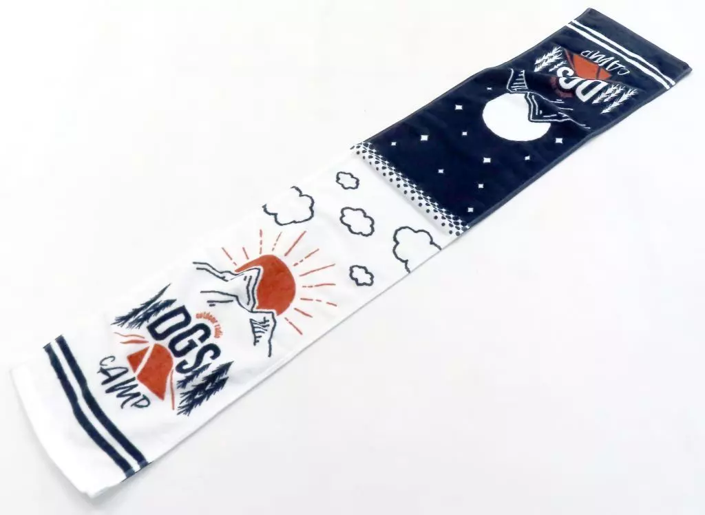 The morning sun and the night moon are drawn on the towel which illuminates the camping site.