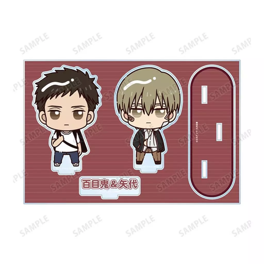 矢代、百目鬼がちょこんと立っているちびキャラを新たに描き起こし、パーツ付きのBIGなアクリルスタンドに仕上げました。