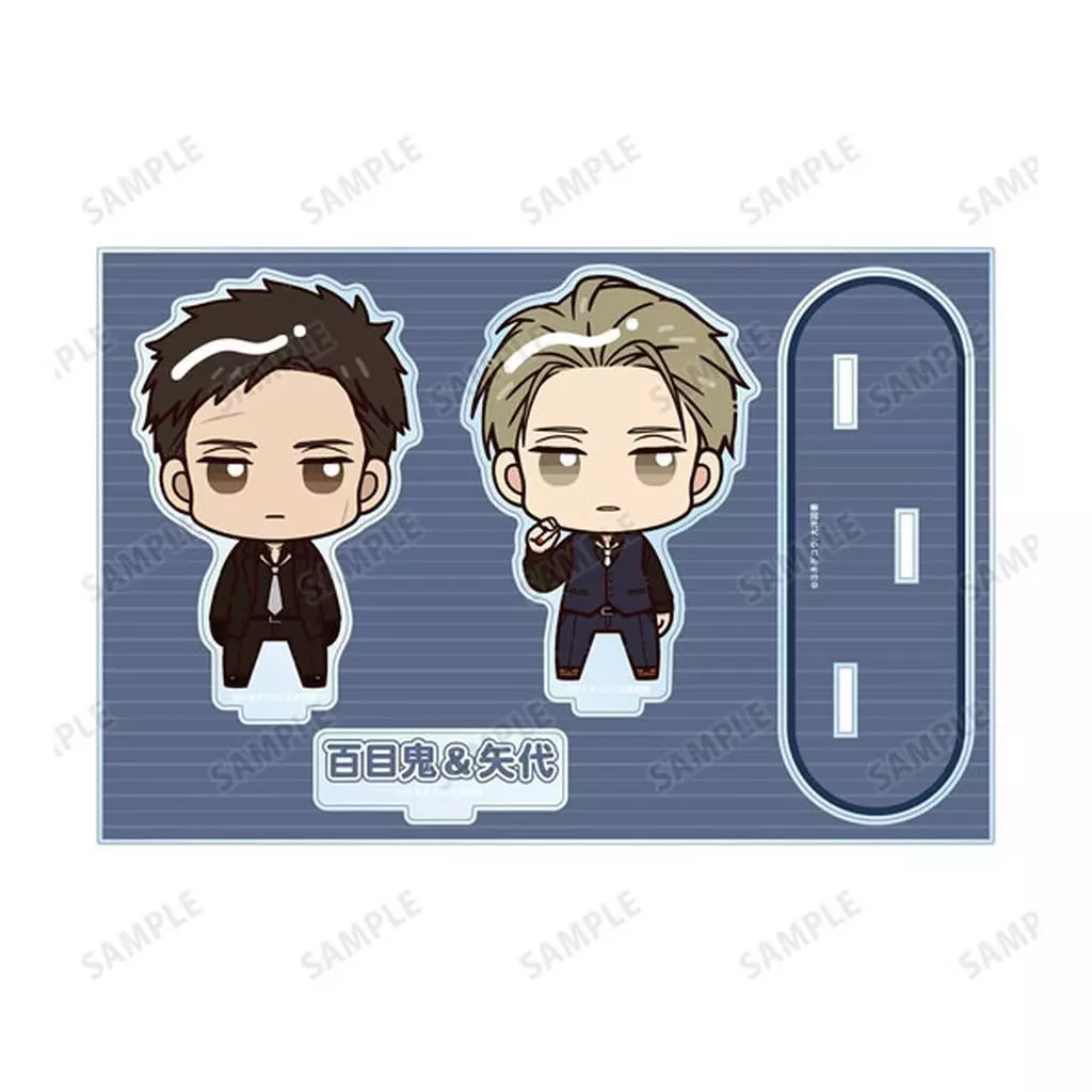 矢代、百目鬼がちょこんと立っているちびキャラを新たに描き起こし、パーツ付きのBIGなアクリルスタンドに仕上げました。