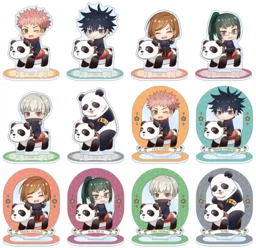 The illustration of Chibi Character by Kojo Yujin, Fushiguro Megumi, Kugizaki no Bara, Senbein Maki, Toge Inumaki, and Panda is made into an acrylic stand.