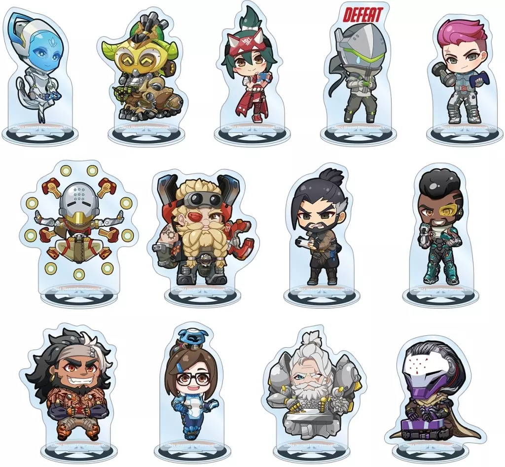Echo, Olisa, Kiriko, Genge, Zaria, Zeniyatta, トールビョーン, Hanzo, Baptist, Mauga, May, Reinhardt, ラマットラ. The acrylic stand is decorated with Chibi Character illustrations of Echo, Olisa, Kiriko, Genji, Zaria, Zeniyatta,, Hanzo, Baptist, Mauga, May,, and.