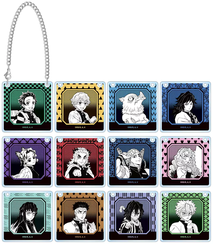 竈門炭治郎、我妻善逸、嘴平伊之助、冨岡義勇、胡蝶しのぶ、煉獄杏寿郎、宇髄天元、甘露寺蜜璃、時透無一郎、悲鳴嶼行冥、伊黒小芭内、不死川実弥のイラストをアクリルのドアプレート風チャームに仕上げました。