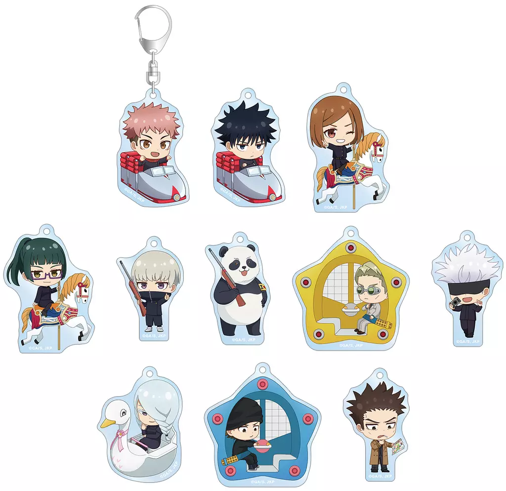 虎杖悠仁、伏黒恵、釘崎野薔薇、禪院真希、狗巻棘、パンダ、七海建人、五条悟、冥冥、猪野琢真、日下部篤也の描き起こしちびキャライラストをメインにデザインし、アクリルキーホルダーに仕上げました。