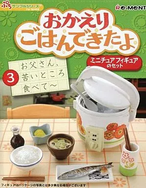 Rice cooker, rice cooker, white rice (large), white rice (small), rice bowl (for rice), small bowl, Pickled Radish, grated daikon, plate, grilled fish, rice bowl (miso soup), miso soup, soy sauce, rice paddle, chopstick stand, chopstick x 4, mini book