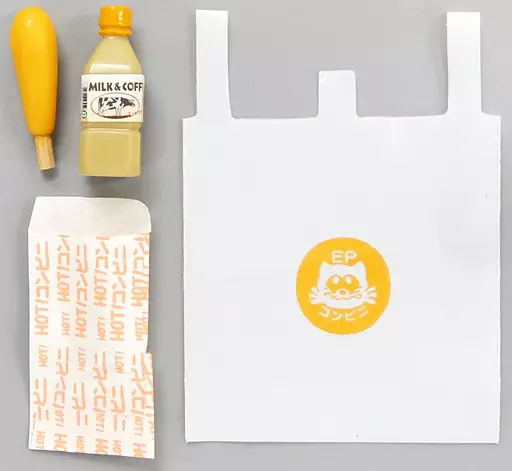 A miniature convenience store bag and a plastic bottle are also included.