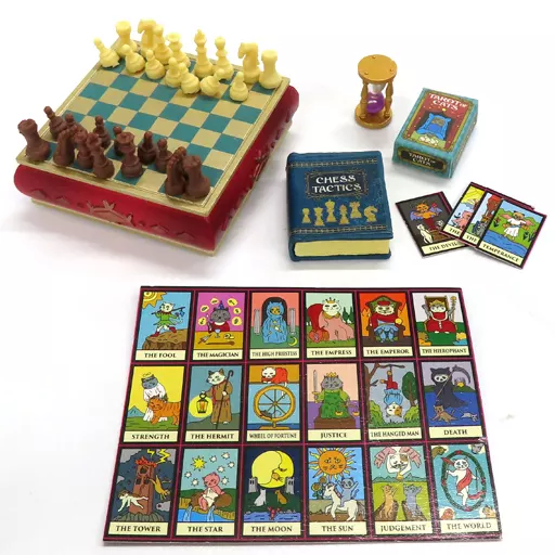 Chess board, chess piece x 13, book, hourglass, tarot card, tarot card box, seal