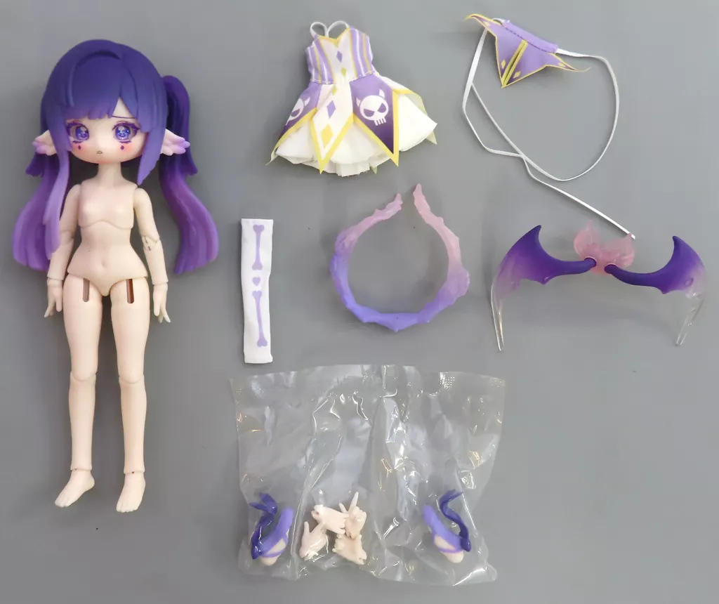 Movable Doll, one set of clothes, one head accessory, one wing part, four replacement hand parts.