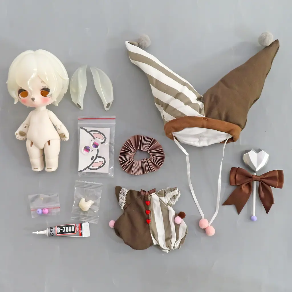 Completed BJD Milk with white skin makeup, 1 set of clown clothes, 2 Eyepiece, heart cane, 1 set of auxiliary materials, box.