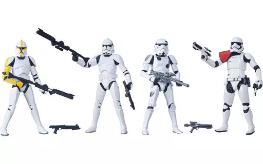 From the former 3 parts, there is a storm trooper with gunshot marks, from Episode 2, a clone trooper commander, from Episode 3, a clone trooper, and from the new "Star Wars / The Force Awakens", a first order stormtrooper officer.
