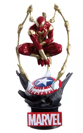There is a detailed reproduction of the characteristic costume with gold and red coloring, 3 arms extending from the back and the Captain America shield entwined with the web.