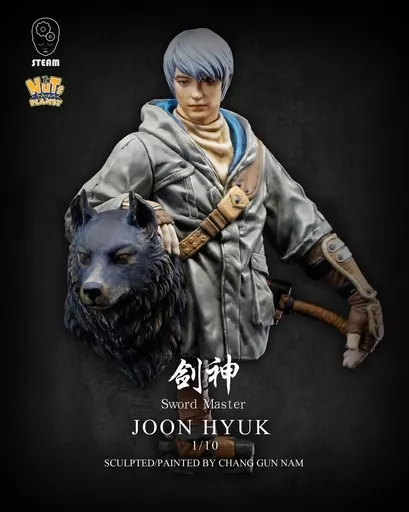 「狩猟犬の様な大型の黒犬を連れ神々が佇む森深くに棲む剣神」をバストモデルとして再現しました。