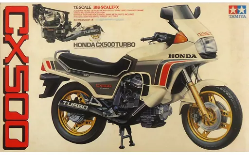 With the cooperation of Honda Motor Co., Ltd., this plastic model assembly kit reproduces the HondaCX 500 Turbo at 1/6 scale.