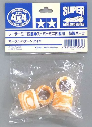 ■「 Racer Mini 4 wd / Super Mini 4 wd special parts "and marble pattern tires (orange x white) are lined up.