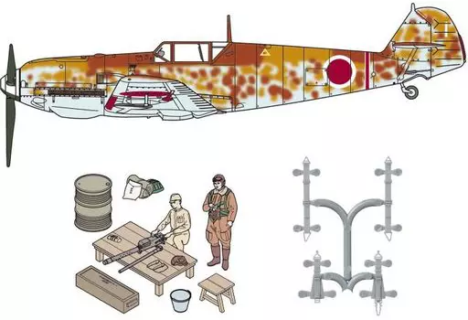New decals are added to the Tamiya Bf0 109 E-7. In addition, parts for scenery such as the Standing Statue of the IJA pilot, maintenance personnel, drum cans and Type 89 fixed machine guns are included.