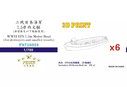 Japanese title: プラモデル 1/700 WW.II 日本海軍 7.5m内火艇 駆逐艦/小艦艇用 6艘セット 3Dプリンター製 ディティールアップパーツ [FSM710353]