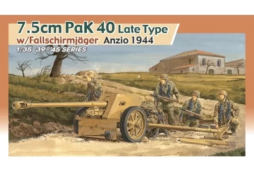 This plastic model assembly kit reproduces the 7.5cmPak40 anti-tank gun operated by the German army in World War II at 1/35 scale. This kit also includes the dropper who played an active role in the Battle of Anzio in 1944.