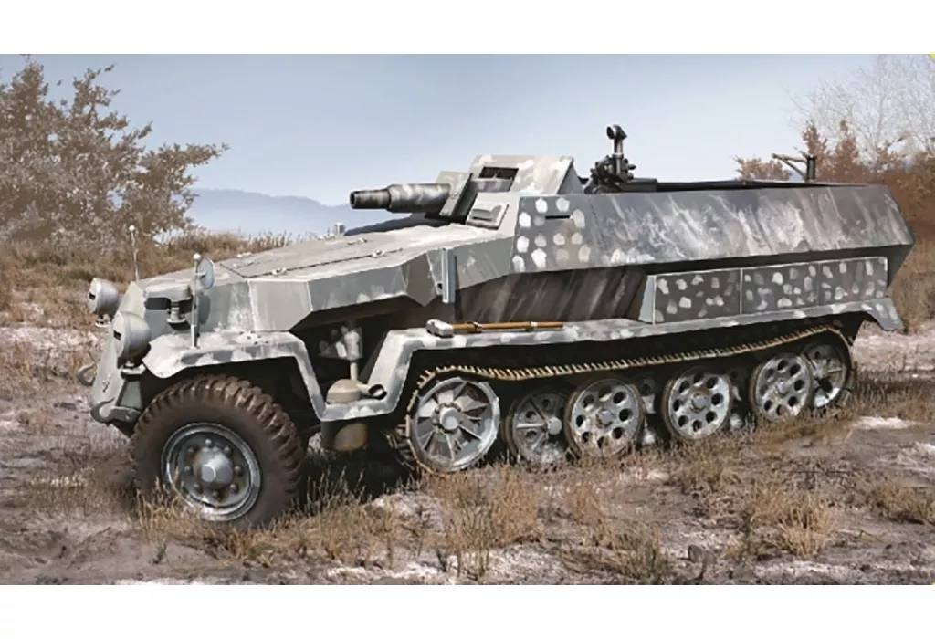 The basic type of the troop transport vehicle was equipped with a Maybach HL-42 series 6-cylinder. Reproducing the Kfz. 251/9 Ausf. C 7.5 cm gun mounted type