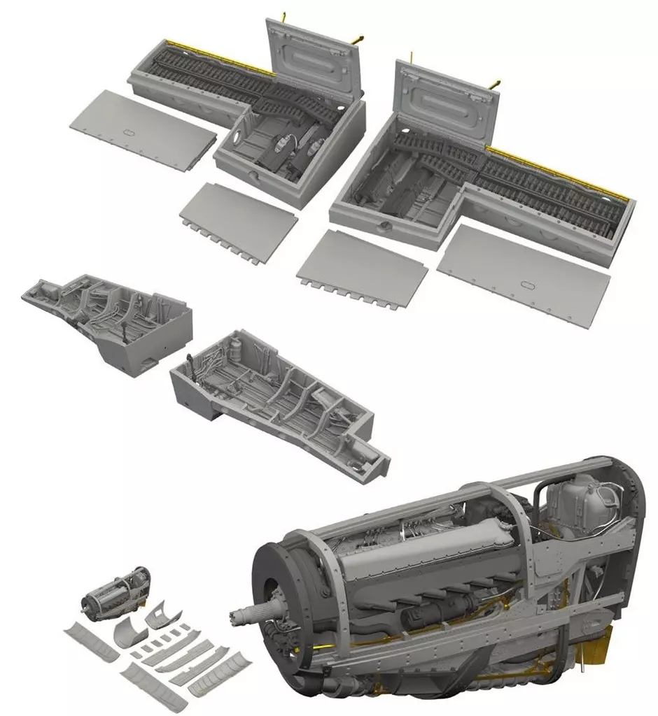 Content : Set of 3 types of gunbay, landing gear hangar and engine.