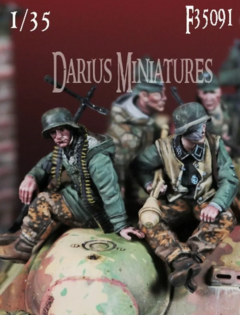 M42防寒服を着用し、右肩にMG34機関銃を掛け、首に弾帯を巻いて車両の上に座る兵士と、革チョッキを着て右手にパンツァーファウストを抱え、左肩にKar98k小銃を掛け、右目に包帯を巻いて車両に座る兵士をモデル化しました。