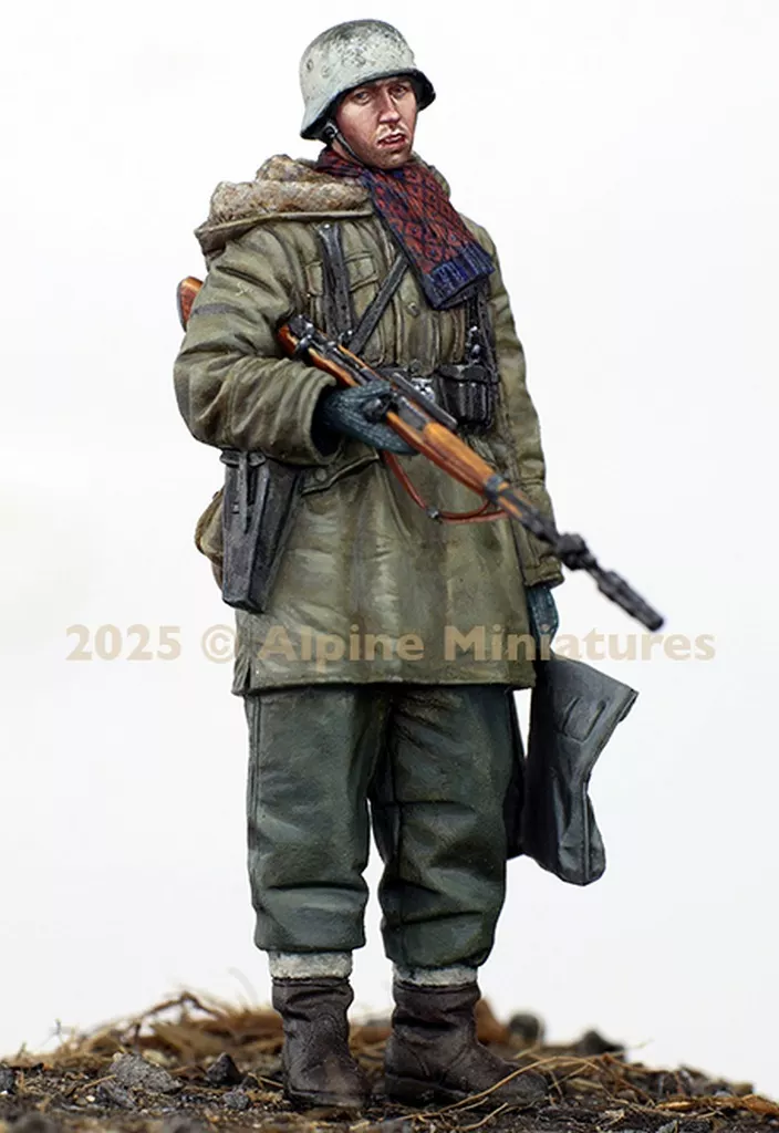 It is modeled as wearing winter equipment M42 winter clothes and holding a Kar98k rifle with a grenade launcher in the right hand.
