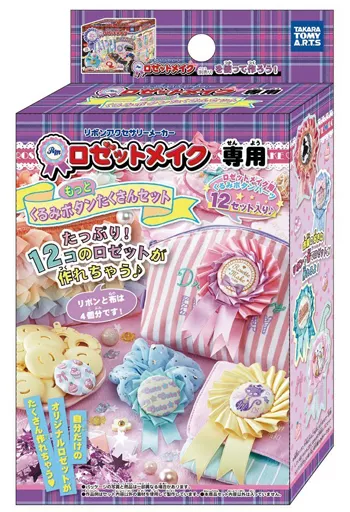 Walnut Button Parts (Top, Bottom) x 12 Sets, Board with Double Sided Tape (Large, Small) x 6 Pieces, Ribbon (Thick, Thin) x 2 Pieces, 4 Types of cloth for Walnut Button x 1 Piece,