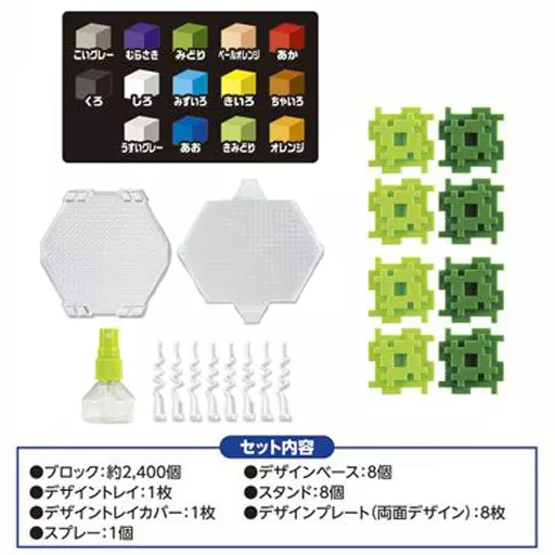 Block set (approx. 2400 pieces), Design Base x 8, Design Tray, Stand x 8, Design Tray Cover, Design Plate x 8, Spray
