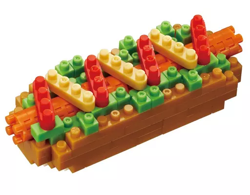 The hotdog, which is a representative of fast food, is reproduced with nano blocks.