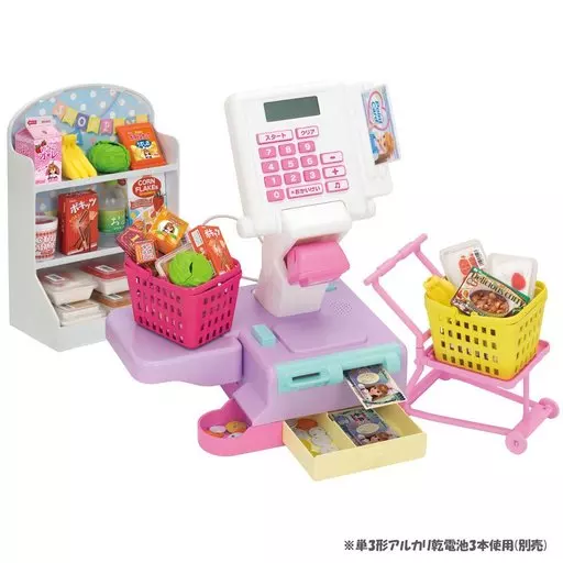 It comes with a shopping cart and shopping basket. You can play shopping at a supermarket.