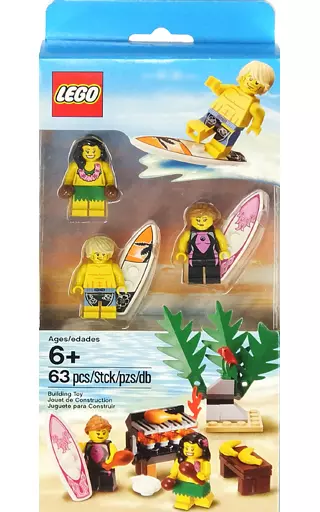 It is a set of surfers, men and women, and hula dancers. It is also a set of palm trees and barbecue grills.