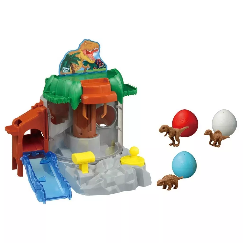 本体、ボード、岩場、トンネル、柱、すべり台、たまご×3、ティラノサウルス(子ども)、スピノサウルス(子ども)、アンキロサウルス(子ども)、シール