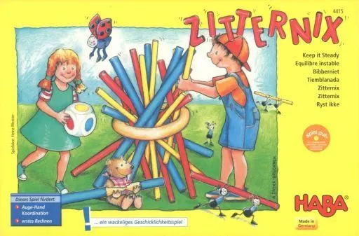 "Sticky" is a game in which players try to score points by pulling out one bar of the color indicated by the die without breaking the pillar supported by many bars of three colors.