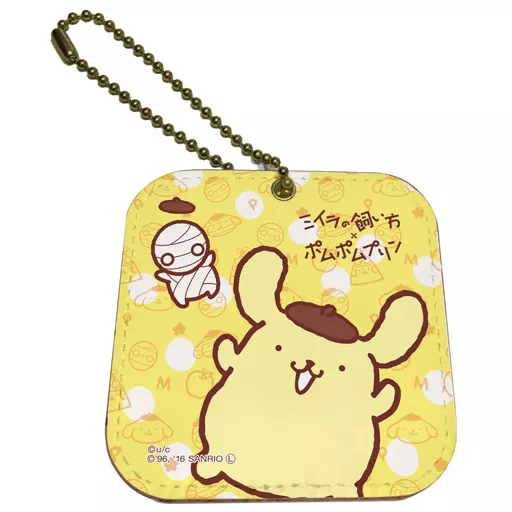 It has a full color print and a mirror on the back. A ball chain can be attached on the side.