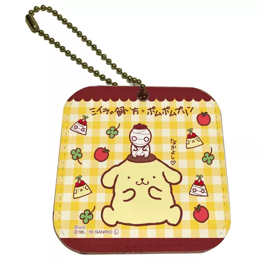 It has a full color print and a mirror on the back. A ball chain can be attached on the side.