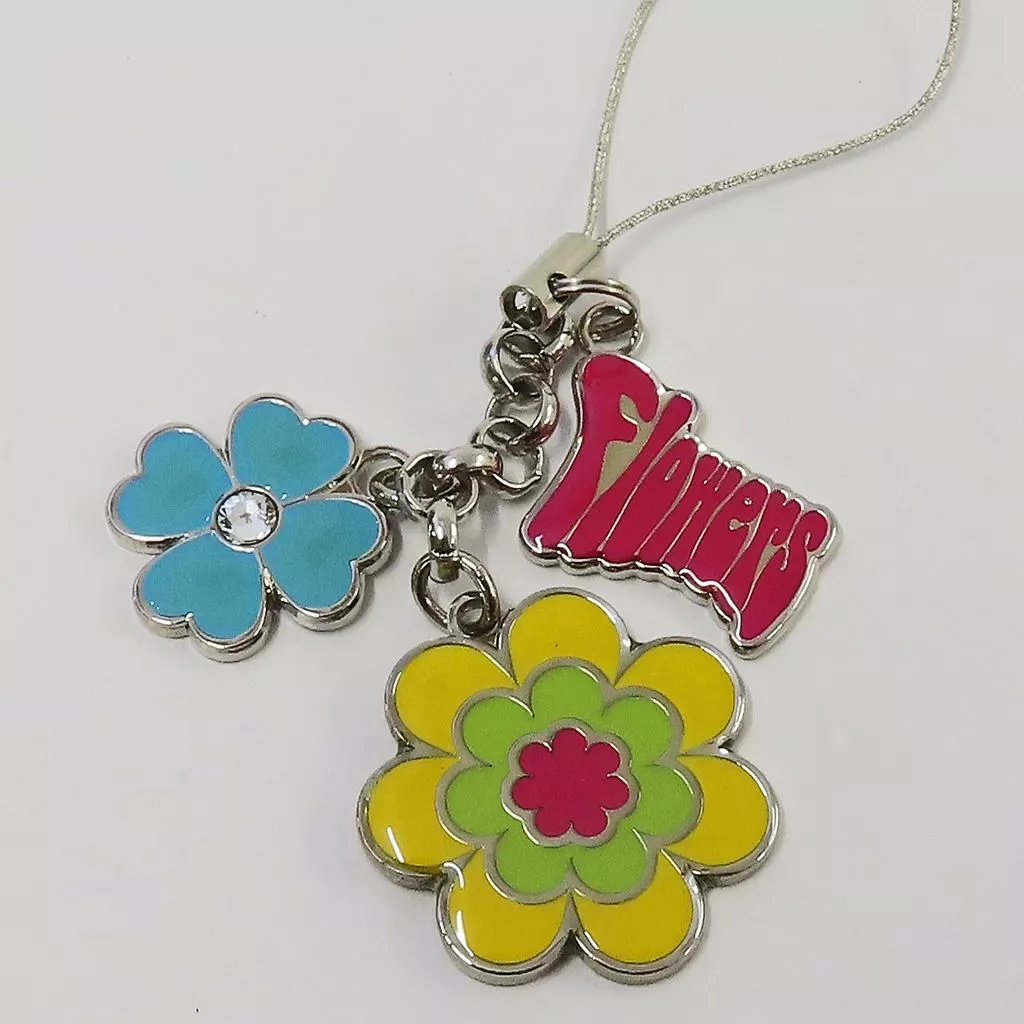 and pink Flowers logo, glittering gorgeous and cute mobile phone strap combined with 3 charms and chains.