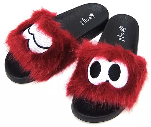 This is a pair of sandals made of long fur with easy-to-wear wine-red color. Attention is paid to the different eyes of Lippy on each foot.