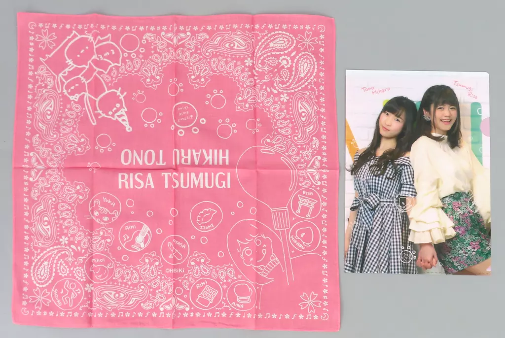 This set includes a bandana with a voice actor design and a plastic trasparent file folder with a photograph taken and taken.